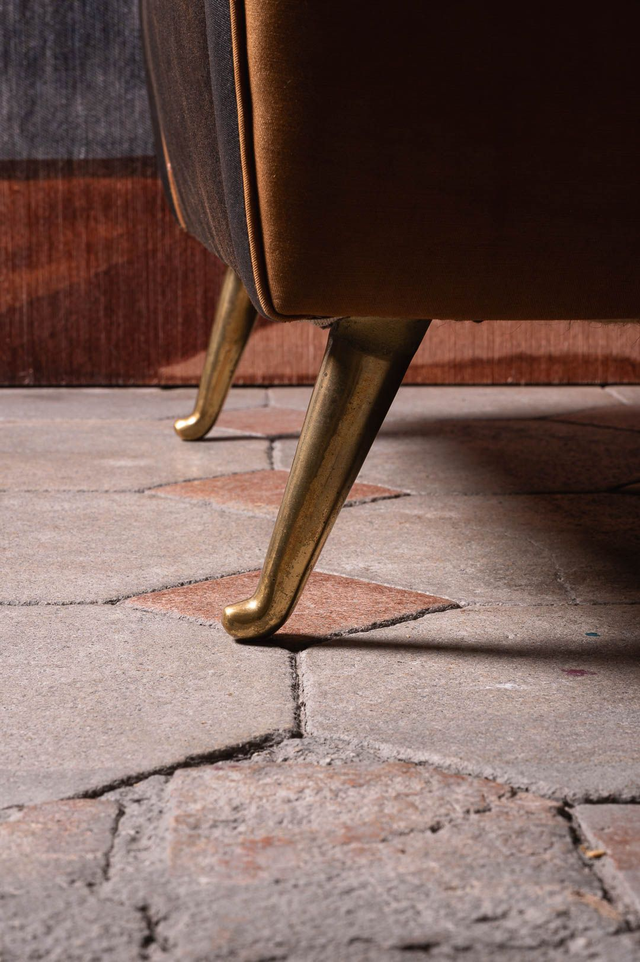Original vintage armchair Design 1950 From Hotel Bristol Merano Fumoir Made in Italy New upholstery by Donghia fabric Brass legs Sit cushion removable For much more info and/or pictures do not hesitate to contact us. Before to buy please ask us all the information you need. We ship all over the world. The shipping cost IS NOT INCLUDED into the item's price. BEFORE TO BUY THIS ITEM, please ask us the shipping cost.