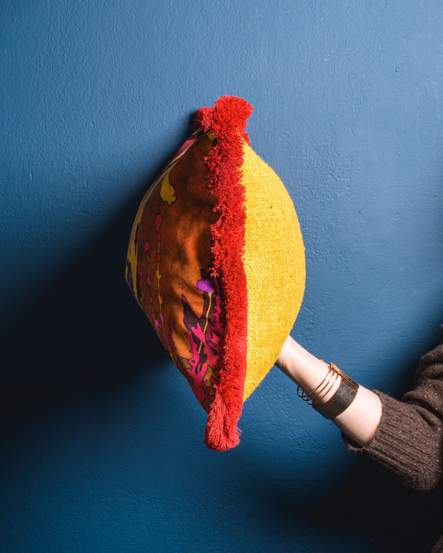 So beautiful decorative cover cushion (double face) Right: multicolor print velvet by Pierre Frey Back: yellow plain colur - 100% raw silk