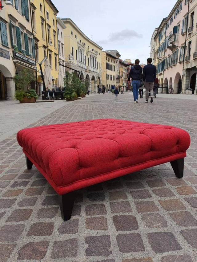 Gorgeus pouff / ottoman Red fabric by Pierre Frey Water based varnished beech Sizes: 86 x 83 x h 30 cm This item is a new product but it has been on our shopwindow: so there is a very light scratch on the wooden legs. Good condition. Please take note. For much more info and/or pictures do not hesitate to contact us. Before to buy please ask us all the information you need. We ship all over the world. The shipping cost IS NOT INCLUDED into the item's price. BEFORE TO BUY THIS ITEM, please ask us the shipping cost.
