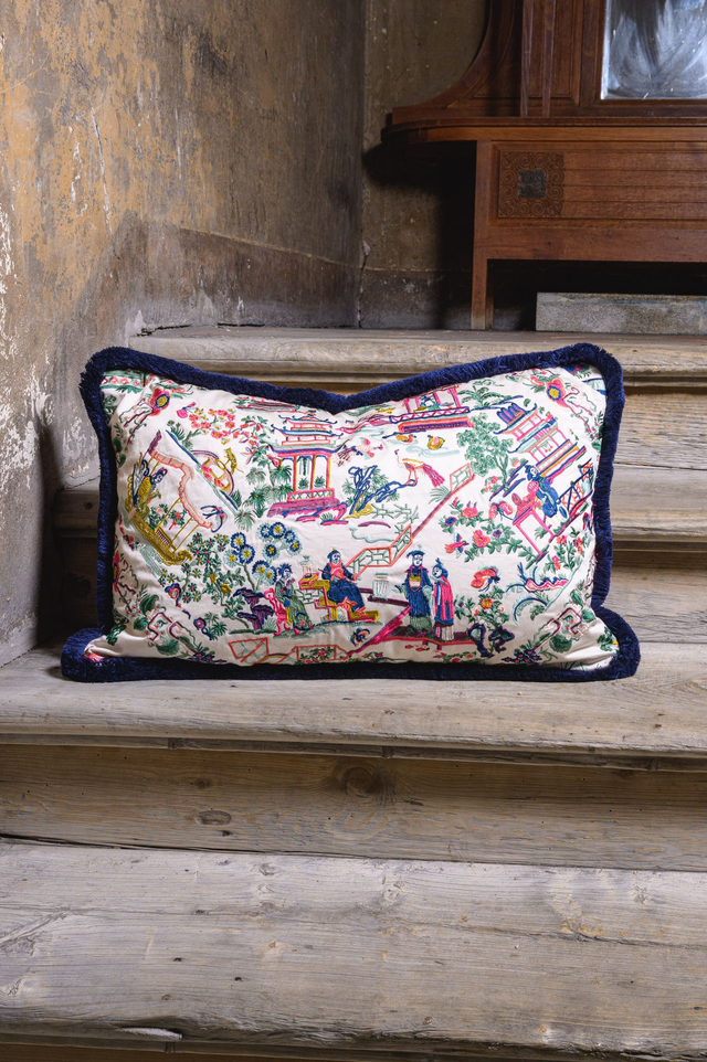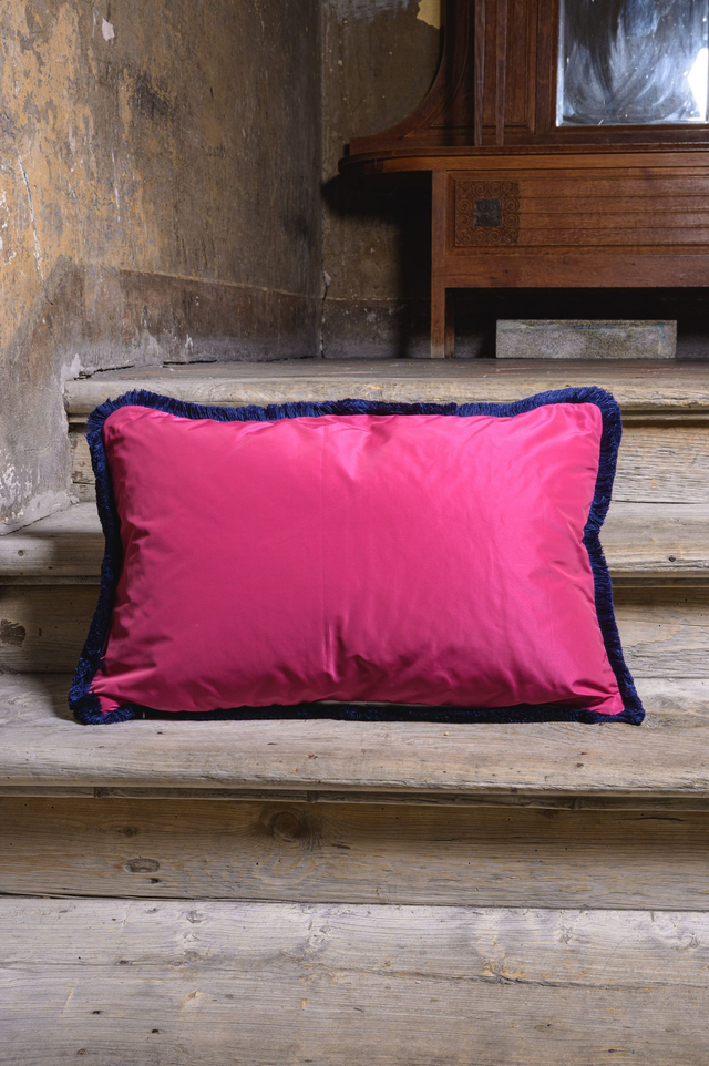 So beautiful decorative cover cushion Removable Double face Right: Pierre Frey embroidery silk fabric Back: plain colour - deep pink Edge: blu trimming Size: 35 x 55 cm Dry clean PAY ATTENTION: every decorative cushion is sold without its inner. If you would like to buy the inner part (100% duck) please ask us: write us a message. For much more info and/or pictures do not hesitate to contact us. Before to buy please ask us all the information you need. We ship all over the world by express courier. The shipping cost IS NOT INCLUDED into the item's price.